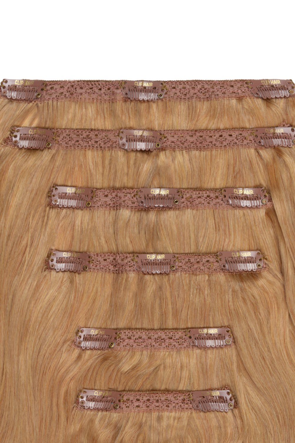 Entdecken Sie unsere meistverkauften Double Weft Clip-In-Haarverlängerungen, die ultimative Lösung für alle Haartypen. Diese Clip-Ins werden fachmännisch hergestellt, um beeindruckende Länge und Volumen zu verleihen und verschmelzen nahtlos mit Ihrem natürlichen Haar für ein unsichtbares Finish. Sie sind für eine schnelle und einfache Anwendung konzipiert und Sie können in nur 5 Minuten eine atemberaubende Verwandlung erreichen.