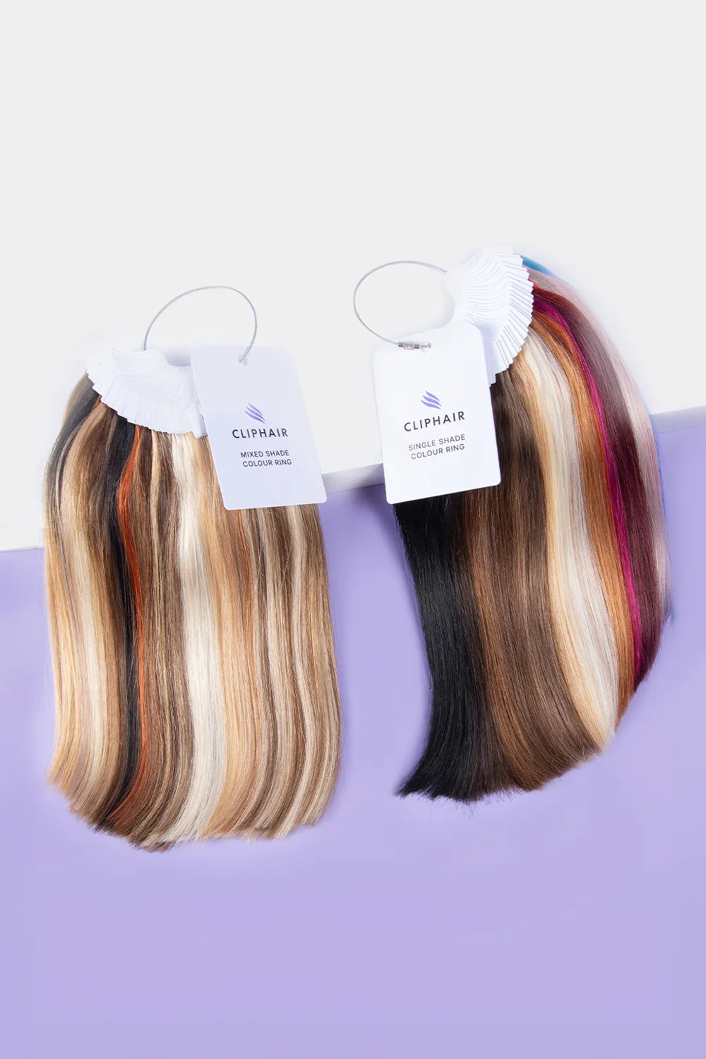 Unser Single Shade Color Ring umfasst alle unsere Volltöne und ist somit ideal für klassische Haarverlängerungsstile. Für diejenigen, die mehrere Farbtöne oder Highlights wünschen, bietet der Mixed Shades/Balayage Color Ring eine luxuriöse Palette an Multitonal- und Balayage-Farben. Um das Beste aus beiden Welten zu genießen, können Sie unser Paket kaufen, das sowohl den Single Shade- als auch den Mixed/Balayage Shade-Ring zu einem ermäßigten Preis enthält.