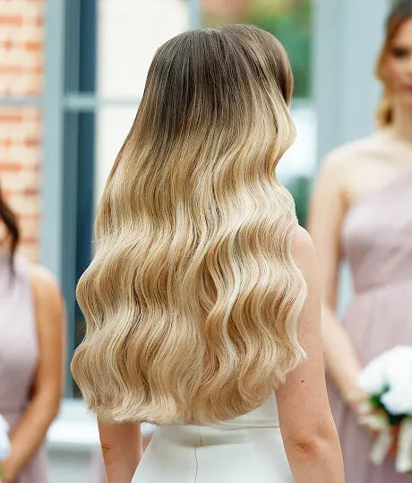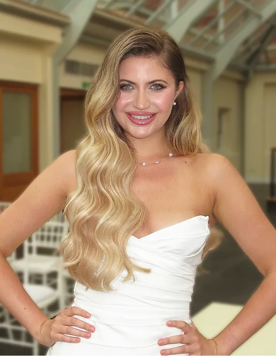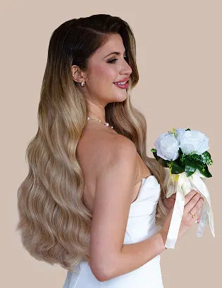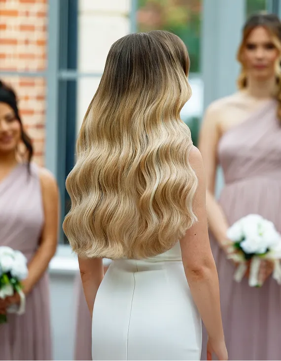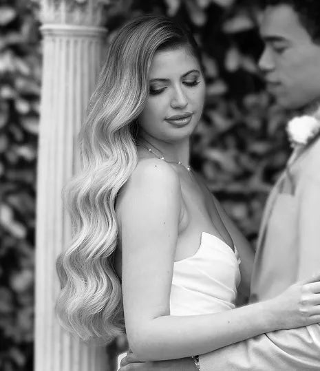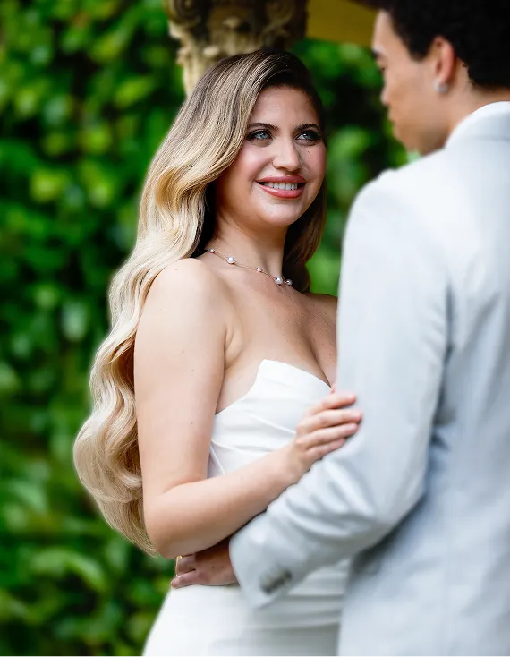 Old Hollywood glamour meets bridal fantasy. Cascading in soft, sculpted waves, this iconic hairstyle captures the timeless beauty of silver screen sirens. Achieved by brushing voluminous curls into glossy, manicured waves, each curve catches the light, framing the bride’s face with ultimate sensuality. Paired with a deep side part and a touch of vintage sparkle, it whispers romance while radiating confidence, perfect for a woman who commands the room with every step down the aisle.