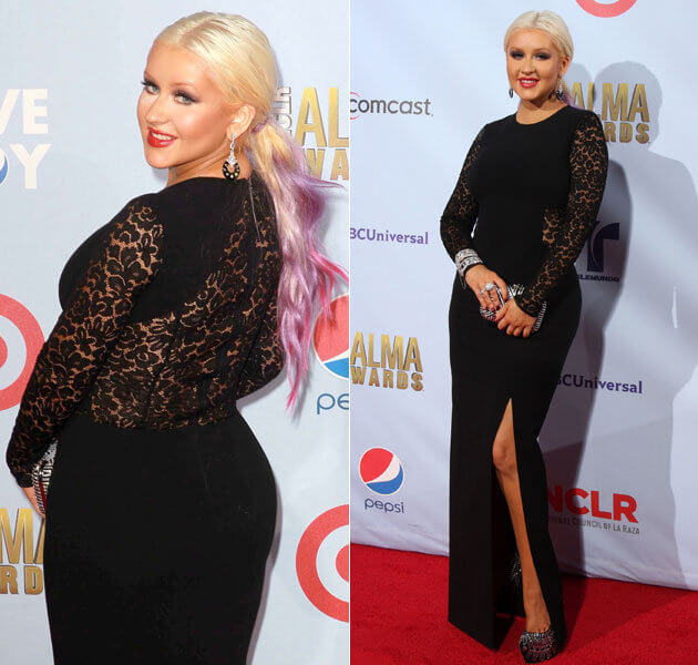 The star toughened up a lace black dress with this funky low slung ponytail. From the front, her look was classy and ladylike, yet from behind with a flash of her dazzling ponytail – Christina showed off her trademark daring style that we have all grown to love.