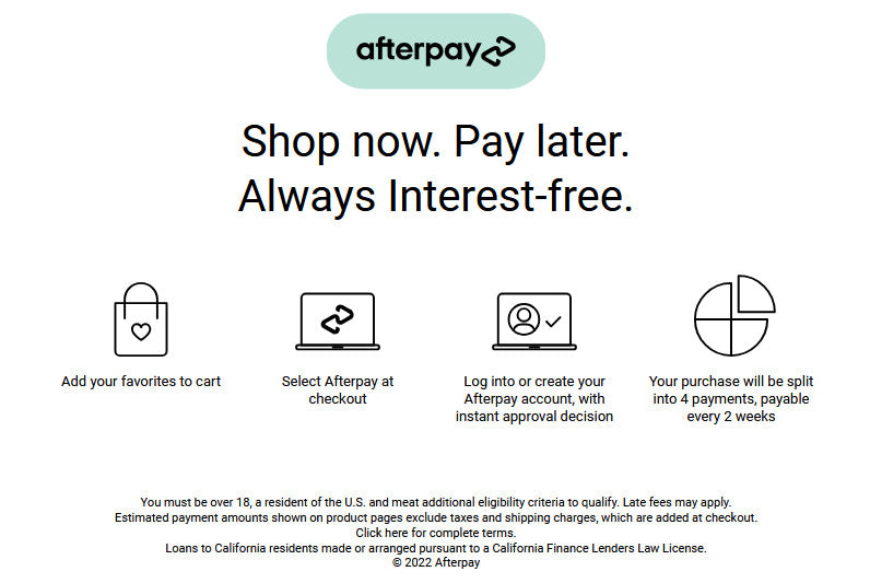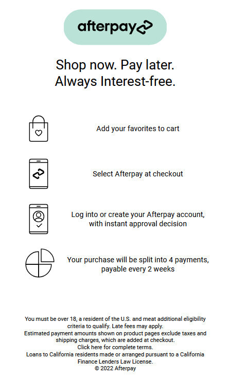 Afterpay is a payment service that lends customers a fixed amount of credit to make purchases instantly and then pay for them in 4 automatic instalments, made every 2 weeks, without any interest (late fees apply). Please use Afterpay responsibly.